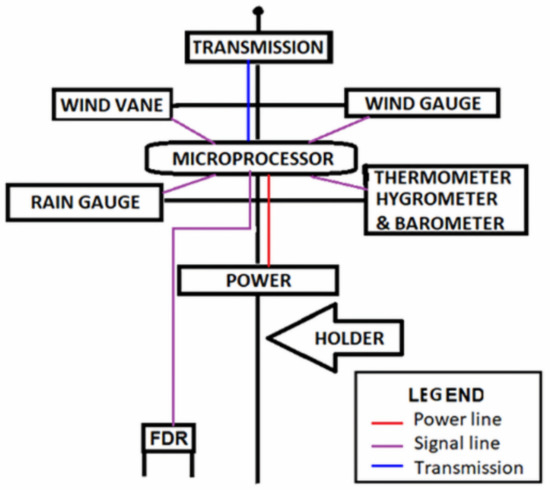 The meteorological monitoring system controls several variables (precipitation, wind speed and direction, soil water content, air temperature, relative humidity, air pressure, etc.), and consequently, it integrates a large number of sensors: a rain gauge, an anemometer, a weathervane, a barometer, a thermometer, a hygrometer, and a soil moisture sensor (Figure 3).
