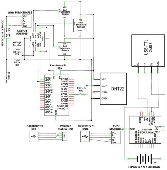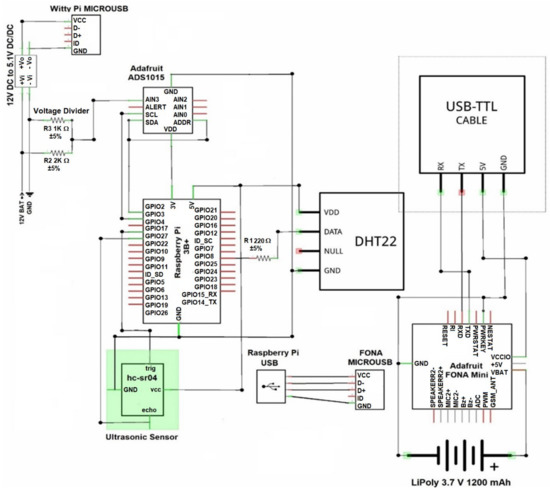 Data transmission is driven by GPRS technology—the GPRS/GSM Adafruit cellular FONA Mini (40 to 60 €), a small GSM cellular module powered by the SIM800, and a quad-band (850/900/1800/1900 MHz) module for connecting onto any global GSM network with any 2G SIM card. It makes it possible to send and receive GPRS data through different protocols (TCP/IP, HTTP, etc.), and to send and receive SMS messages, phone calls, and FM radio broadcasts. It operates with AT commands and its circuitry can run from 2.8 V to 5 V DC [42]. To complete data transmission, a quad-band antenna (3 to 5 €), a 3.7 V DC 1200 mAh Lipoly Battery (5 to 10 €), a USB- TTL serial cable, and a USB to micro-USB cable are also required (both: 8 to 15 €).