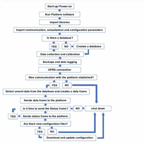 The software developed to control the platform was written in Python 3, an interpreted, high-level, general-purpose, and open-access programming language [40]. It runs automatically after the equipment’s startup. It first loads the initial parameters and libraries. Then it verifies the existence of a database (if there is no database, it creates one), reads the sensors, calibrates the data to ensure the highest precision and accuracy, stores the data within the database, establishes communication with the Web platform through the GPRS module, and transmits the data not previously sent (Figure 4).