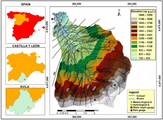 The meteorological monitoring system was located in a central area of the basin at 40°23′45.5″ latitude N, 4°39′06.5″ longitude W, and 896 m a.s.l.; and the hydrologic monitoring system at 40°24′18.3″ latitude N, 4°39′39.2″ longitude W, and 776 m a.s.l. The latter was mounted under a bridge near the mouth of the main channel, not only to take advantage of the infrastructure as support for the equipment, but also because it has a known rectangular and an invariable concrete section, which facilitates hydraulic calculations, and because the radar water level sensor is also located in this place.