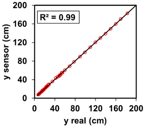 With laboratory calibration, we obtained a coefficient of determination between sensor measured values and the real water level of R2 = 0.99 (Figure 6). The mean absolute error was ±0.51 cm, the relative error was 1.65%, the RMSE was 0.41 cm, and the maximum absolute error between repetitions was ±1.39 cm.
