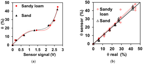 The CV was higher at the lower θ within the humidity interval and decreased as θ increased. This performance could be caused by poor sensitivity to changes when dealing with high θ values (see Figure 7a); nevertheless, the measurement errors were amplified despite the smaller CV due to the sensitivity loss in the sensors (Table 3). The R2 results were: 0.98 and 0.99 for the sandy loam and sandy soil, respectively (Figure 7b). Sandy loam soil presented larger RMSE (15.32%) and MAE (±2.2%) than sandy soil (1.87% and ±0.93%, respectively); smaller error values may have been due to the more homogeneous composition of the sandy soil.