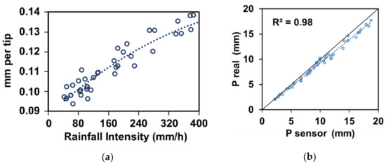 A total number of 80 tests were performed at different rainfall intensities, up to a maximum of 400 mm·h−1. Of these, 45 were used to calibrate the sensor and 35 for validation by R2 and RMSE.