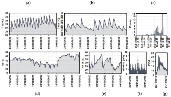 Meteorological monitoring system data at different times, as shown on the Web platform: (a) inside air temperature; (b) outside air temperature; (c) precipitation; (d) outside relative humidity; (e) inside relative humidity; (f) wind speed; (g) soil moisture water content.