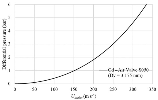 The pressures in the air pockets simulated by the CFD model are compared with the Experimental Test pressures collected in [16] in the hydraulic lab located at the University of Lisbon, Portugal. The hydraulic installation is made up of an irregular polyvinyl chloride (PVC) pipe with a nominal diameter of 63 mm, which has a total length of 7.30 m, with horizontal reaches of 2.05 m, and inclined reaches at an angle of 30° with lengths of 1.50 m. Tests were done using a hydro-pneumatic tank of 1 m3 to produce the inlet pressure. The pipe system is made up of an air valve S050 (manufacturer A.R.I.) with a inner diameter of 3175 mm and an outflow discharge coefficient of 0.32, which was theoretically calibrated by means an air valve characterization curve (see Figure 1). A pressure transducer was located next to the air valve at the highest point of the pipe system to measure the pressure patterns. The regulation of the system is managed by a PVC-U +GF+ electro-pneumatic ball valve type 230 (Georg Fischer Piping Systems Ltd., Schaffhausen, Switzerland). For all simulations, for the experimental facility, only the electro-pneumatic ball valve located in the section connected to the hydropneumatic tank is activated, for which a full opening is given with an opening time of 0.2 s. Figure 2 shows the experimental components.