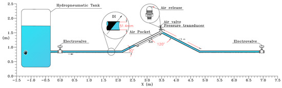 For the study of the hydraulic phenomena resulting from filling processes in pipes with entrapped air, research has been carried out through the development of mathematical models based on a piston flow analysis that simulate the water–air interface, analyzing the liquid phase, such as rigid column models [7,8,9,10] and elastic column models [6,11,12,13]. The authors of [14,15] have proposed a mathematical model for the analysis of hydraulic transients that occur during rapid filling. They have obtained good approximation of the maximum pressures reached within a cast-iron pipeline of 1020 m length and DN400 of nominal diameter. The authors of [16] presented a mathematical model to simulate rapid filling processes and to simulate the hydraulic and thermodynamic variables in an experimental facility of 7 m length and 63 mm DN of nominal diameter, where they determined that mathematical model is suitable for the reproduction of the first oscillation in the pressure evolution and extreme values of pressure during the filling process. The authors of [17] displayed the limitations of one-dimensional models under certain scenarios that can be overcome using of two- and three-dimensional models.