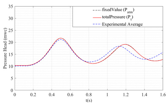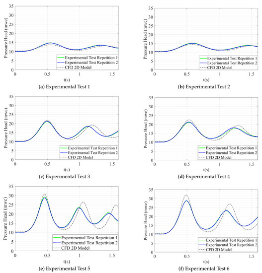 When is higher ( = 7.64 mwc), the determination of peak pressure loses reliability. For Experimental Test No 3, there is no practical evidence of significant differences in the first overpressure peak. On the other hand, for Experimental Test No. 5, the maximum pressure value of the air pocket that the simulation obtained is 30.20 mwc and the measured one is 29 mwc (see Figure 4c,e). The 2D model maximum pressure results during the first peak pressure of the hydraulic transient presented maximum differences of 2.43 mwc, with maximum relative errors of less than 9.1% and minimum of 0.71%, which are acceptable errors in the comparison between experimental and CFD model results [24]. Maximum pressures simulated by the 2D model () make a highly approximate match to the maximum experimental pressures () (see Table 3).