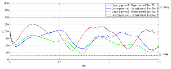 In the present research, a refined mesh to the near-wall region was developed through the integration of the wall functions to derive the velocity profile. In the analysis, the , variable was defined as the non-dimensional distance from the wall towards the pipeline interior. Figure 7 shows the results of in the Experimental Tests 1, 3, and 5. There, the model presents an acceptable range between 30 and 300 for the turbulent processes simulation, which is an adequate range for evaluation of the non-dimensional distance [26].