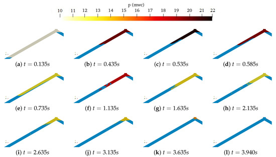 Figure 8 shows that the water column occupies the interior of the pipeline, compressing the air pocket and allowing the expulsion of the air, resulting in the first peak of overpressure at a time of 0.53 s. However, a progressive expansion is generated with the need to release the compression energy accumulated in the air pocket, between the time instants t = 0.535 s to t = 0.735 s, resulting in a pressure drop of the air pocket. Subsequently, at time instant t = 1.135 s, a second overpressure peak is generated, due to the constant thrust of the water column on the air pocket, which expands again up to time instant t = 1.635 s. This phenomenon is progressive until the expulsion of the air pocket.