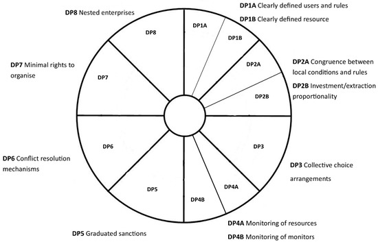 Ostrom compiled a set of eight design principles, or broad institutional regularities or ‘best practices’ which, she posited, are conducive to successful CPR governance. Ostrom’s design principles are: 1- clearly defined boundaries in respect of (a) the users of the resource and rules for extraction and (b) the biophysical shared resource; 2- local rules and proportional costs and benefits; 3- collective choice arrangements; 4- monitoring of (a) the resource and (b) the monitors; 5- graduated sanctions; 6- rapid, low cost and local conflict resolution mechanisms; 7- users rights to organize themselves; and 8- nested enterprises [7,12,46,47,48]. The design principles ‘explain under what conditions trust and reciprocity can be built and maintained to sustain collective action in the face of social dilemmas posed by CPRs’ [47] (p. 39). Essentially, the design principles embed the conditions to enable cooperative efforts and thereby manage conflict.