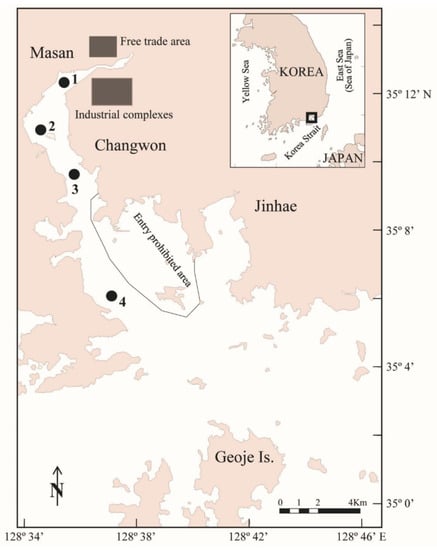 - Lee, C.-W.; Min, B.-Y. Pollution in Masan Bay, a matter of concern in South Korea. Mar. Pollut. Bull. 1990, 21, 226–229. [Google Scholar] [CrossRef]