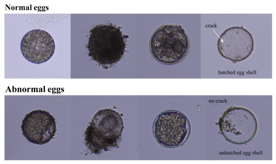 The abundance of copepod eggs in the seabed was measured using a sediment corer. The sediment obtained by cutting the upper 0.5–1.0 cm of the core was filtered through a 45 µm mesh, and the remnants on the mesh were recovered, fixed in a formalin solution, and finally concentrated in a 50 mL tube in the laboratory. After collecting 1 mL of the concentrated sample in the Bogorov counting chamber and diluting it with filtered seawater, the copepod eggs were counted three times under a dissecting microscope (Olympus, SZX7, Tokyo, Japan), and the final abundance was converted to eggs per unit area (eggs m−2). The normality of the eggs was evaluated while simultaneously determining the egg abundance. In this study, the normal and abnormal eggs were distinguished based on the cracks in the eggshells and were measured by referring to the results of Blades-Eckelbarger and Marcus [28]. The eggs that appeared to be physically damaged due to cracked shells or missing egg contents were considered abnormal [29,30] (Figure 2). Calanoid eggs were identified using morphological characteristics based on Kasahara et al. [31].