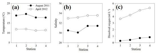 The water temperature variation was <2 °C in the bottom layer during August and <1 °C in April (Figure 3a). In addition, the salinity varied narrowly by <1.5 at the stations, during both months (Figure 3b). The salinity varied from 30.5 to 31.4 in August and from 33.0 to 33.6 in April, and was particularly low (<30.6) in the inner bay (Station 1, 2) during August. The DO concentration formed a hypoxic water mass of <1 mL L−1 at all sites in August near the bottom (Figure 3c). In contrast, the DO concentration in April was within the normal range of 3.7–5.3 mL L−1. The DO concentration increased towards the outer bay during both months.