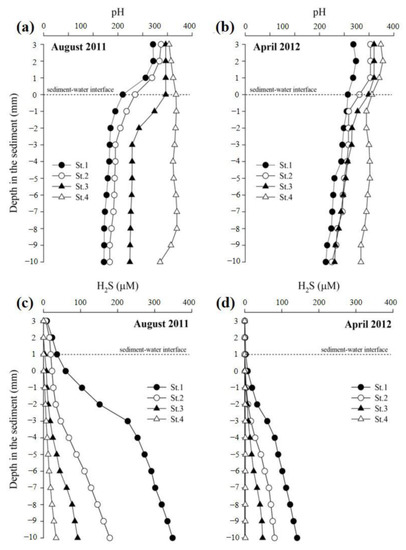 The vertical sediment pH profiles are shown in Figure 4. The pH varied from 7.6 to 8.1 (August) and 7.8 to 8.1 (April), and was particularly low (<7.8) in the inner bay (St. 1, 2) during August (Figure 4a,b). The sediment pH tended to significantly decrease from the outer bay to the inner bay during both August and April.