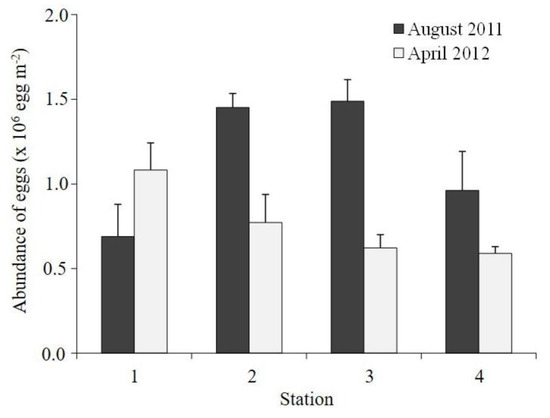 The abundance of calanoid eggs ranged from 0.69 to 1.49 × 106 eggs m−2 during August and 0.59 to 1.08 × 106 eggs m−2 during April (Figure 5). The egg abundance was >1.00 × 106 eggs m−2 in August (Station 2, 3) and April (Station 1), and tended to increase towards the inner side of the bay during April.