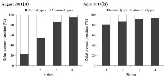 Relative composition of normal and abnormal eggs in the sediment of Masan Bay. (a) August 2011, and (b) April 2012.