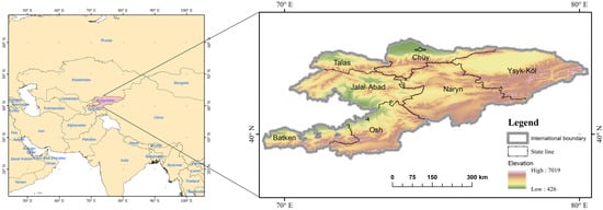 Kyrgyzstan, located in the Tian Shan Mountains and Pamir-Alay Mountains in central Eurasia (Figure 1), has a temperate continental climate, strong solar radiation and uneven precipitation distribution, with little summer precipitation, more winter precipitation, annual precipitation of 200–800 mm and is a typically dry-farming region. Land area of Kyrgyzstan is about 119 thousand square kilometers, includes 6 states, 2 cities, 44 districts, 31 cities, 453 prefectures and 1855 towns. The population density averages 30 people per square kilometer. According to statistics, at the end of 2015, the population was approximately 6.362 million. More than a third (33.7%) of the population lived in cities, and about two-thirds (66.3%) of the population lived in rural areas. Affected by transportation, technology and economy, Kyrgyzstan’s industry is lagging behind, and agriculture is its main economic pillar. Kyrgyzstan is rich in water resources. However, due to an imperfect irrigation system, the utilization rate of agricultural water is very low, which still faces the problem of water shortage. Climate change also has adverse effects on agricultural production. The monitoring of 19 weather stations in Kyrgyzstan over the past 30 years shows that the temperature in the piedmont region of the Kyrgyz mountains and the Talas valley has increased by an average of 0.05 °C per year. It affects the adaptability and yield quality of crops, as well as their resistance to diseases, insect pests and weeds.