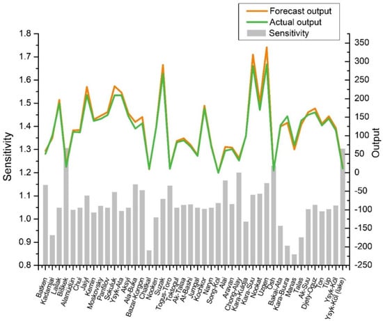 Based on the crop data of 44 regions of Kyrgyzstan from 1990 to 2014, the gray prediction model was used to predict the crops of each region in 2015, and the sensitivity (r) of each region was calculated (Figure 2).