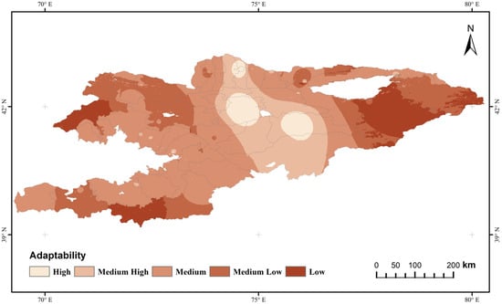 Adaptive capacity measures the ability of an agricultural system to cope with climate change and its ability to recover from disaster. In this study we assumed that the combination of GDP, population density and fixed asset investment provides the adaptive capacity of Kyrgyzstan’s agricultural system. The results are shown in Figure 3 that Kyrgyzstan’s agricultural adaptability index has a high spatial distribution in the middle and low distribution in the east and west. Among them, the eastern region, with the highest altitude, has the lowest adaptability, while the western region has lower adaptability, except for the surrounding areas of the city. The agricultural system in central Kyrgyzstan has strong adaptability, especially near the capital city of Bishkek. At the same time, the urban clusters in the central mountainous region also show strong adaptability. Each state of Kyrgyzstan invests in infrastructure construction differently. In the central part, due to the aggregation of several large cities, the fixed asset investment and population density are both high, so it has the highest adaptability, which gradually decreases outward. There are also several relatively developed cities in western Kyrgyzstan, but these cities are not connected together. As a result, only sporadic areas in southern Kyrgyzstan show high adaptability of the agricultural system. Although Kyrgyzstan has abundant water resources, the country still lacks large-scale water storage equipment, which makes it difficult to allocate water resources. At the same time, aging irrigation projects and imperfect supporting facilities in the central and western regions lead to low efficiency in agricultural water use, and limit the expansion of farmland irrigation area, resulting in poor adaptability of agricultural production.