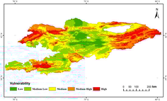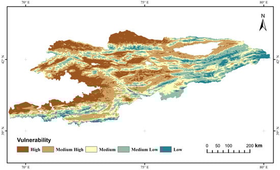 By overlaying the three dimensions of sensitivity, exposure and adaptability, the results of Kyrgyzstan’s agricultural system vulnerability are shown in Figure 5. Through the above analysis, it is determined that the vulnerability index of central Kyrgyzstan has a high score, and the vulnerability gradually weakens from the central to the east and northwest. The higher-elevation agricultural system in eastern Kyrgyzstan has a higher vulnerability and is not conducive to the development of local agriculture. Although the region has relatively abundant water resources, it is vulnerable to various natural disasters due to the large terrain fluctuations. Agricultural systems are very sensitive and easily affected by factors such as terrain and precipitation. In addition, the infrastructure construction in the region is relatively backward, and the impoundment facilities are imperfect, which results in the weak adaptability of the agricultural system in the eastern region. The above two aspects make the agricultural system in eastern Kyrgyzstan relatively fragile and unsuitable for the development of a planting industry. In addition to the high-altitude areas in the east, the agricultural system vulnerability index in the areas around Naryn and Osh in northwest and southwest Kyrgyzstan is also at a relatively high level. Osh is one of the important agricultural production areas in Kyrgyzstan. However, the results of this study found the region sensitive to climatic factors, it is the agricultural system with a higher degree of drought exposure and the backward agricultural infrastructure makes its adaptability relatively weak. The combination of these factors leads to the relatively high vulnerability of the agricultural system in this region.