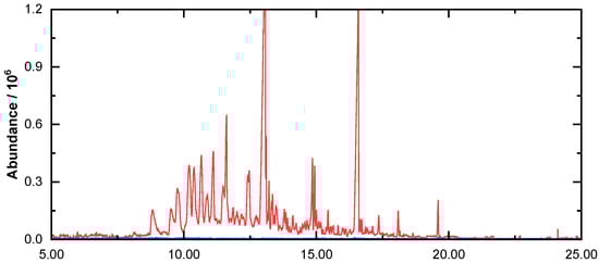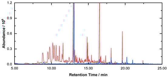GCMS chromatogram of VOCs and sVOCs present in the commercial PE stock (red) and the absence of these compounds after 50 h of heating at 70 °C (blue).