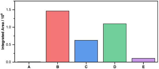 Integrated areas from GCMS peaks for n-dodecane extracted (SPME) from: (A) 3.7 ppm dodecane in water; (B) original PE in water, ~0.5 MGy; (C) original PE in water, ~2 MGy; (D) original PE in saltwater, ~0.5 MGy; (E) original PE in water, no irradiation. The vertical axis represents 109 integration values.