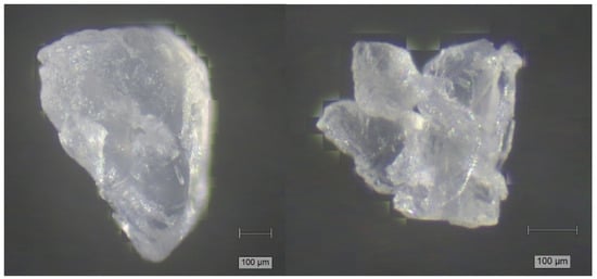 PE microplastic particles viewed using dark field microscopy. The left image is a non-irradiated PE particle, and the right image is post-high-dose irradiation.