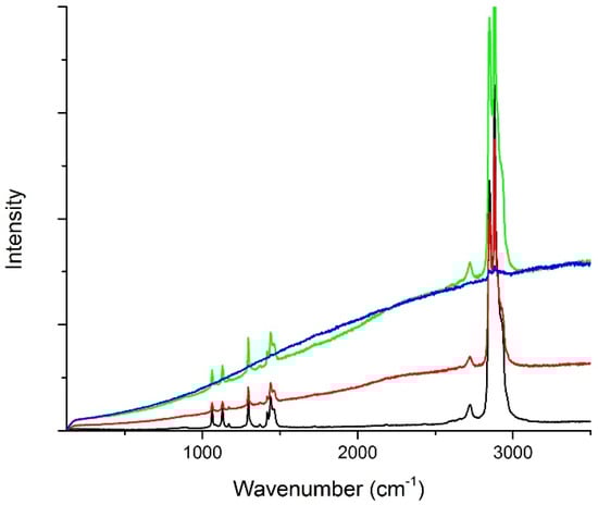 Figure 5 shows representative Raman spectra for non-irradiated PE (black trace) and irradiated PE samples. The Raman signals, exemplifying chemical structures, are essentially the same for all of the samples. Further examination of the extended scan of the Raman fingerprint region out to the CH stretch bands indicates an increase in the fluorescence background for the irradiated PE samples. Such a fluorescence increase can indicate the formation of defects or other impurities on the PE surface. However, no impurities were identified. The absence of data showing chemical changes of the hydrocarbon backbone suggests that PE microplastics will persist, and possibly combine to form larger particles when in contact with other microplastics in low O2 to anerobic aqueous environments. These data support the expected reactivity in Equations (3) and (5), crosslinking and fragmentation, predicted to primarily occur under the low O2 conditions.