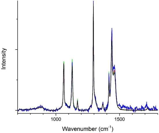 Baseline subtracted high-resolution Raman spectra showing the C‒C stretch, CH2 twisting and CH2 bending bands of gamma irradiated PE in fresh water (red trace), salt water (green trace), and Lake Michigan water (blue trace) showing minimal changes in comparison to the stock PE (black trace).
