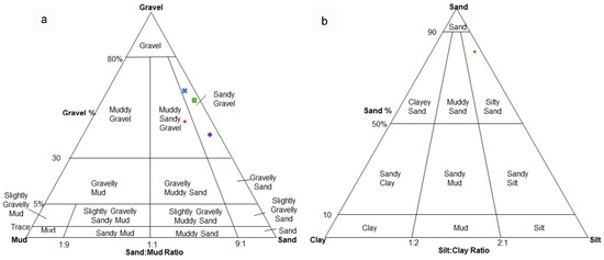 Granulometric composition of the samples: (a) shows gravel–mud–sand diagram in which are samples of the Mala Martinska Cove, MMART0-3 (×) and MMART5 (♦), Mala Stupica Cove, MSTUP0-3 (■) and tailings samples (•). In the sand–clay–silt diagram (b), only dust sample is shown (•).