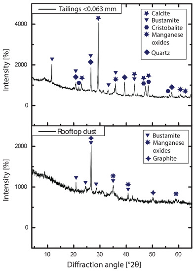 The XRD data of the tailings (<0.063 mm) show calcite (CaCO3), bustamite ((Ca, Mn)3Si3O9), cristobalite (SiO2), quartz (SiO2) and manganese oxides (MnOx; Figure 3).