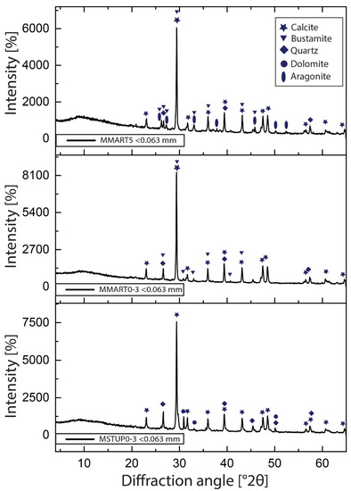 The tailings sample showed that the carbonate content in the fraction < 0.063 mm is higher (40.7% carbonates) than in the tailings bulk sample (34.4% carbonates; Table 1). The higher carbonate content in the <0.063 mm fraction could be explained by the fact that the bulk samples also contained larger fragments that include vitreous material and fragments with a metallic lustre and thus more amorphous and artificially derived products, which was not the case for <0.063 mm. The dust sample had a carbonate content of 7.72%. Sediments from Mala Martinska Cove have a higher content of carbonate compared to dust and tailings (Table 1). In addition, the deeper layer (MMART5) contains 8% higher carbonate content than the sample from the shallower layer (MMART0-3). The bulk samples also have 15% (MMART0-3) and 26% (MMART5) higher carbonate content than the fraction < 0.063 mm. Mala Stupica Cove shows high carbonate content of 78.3% carbonates in the fraction < 0.063 mm [30].