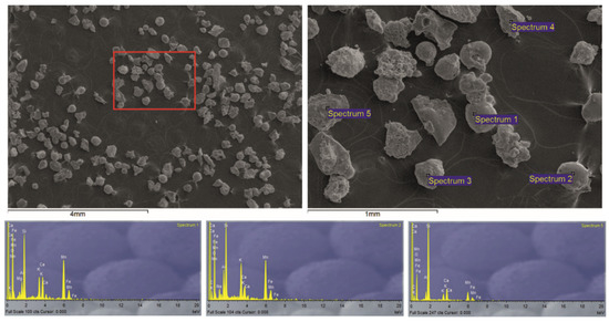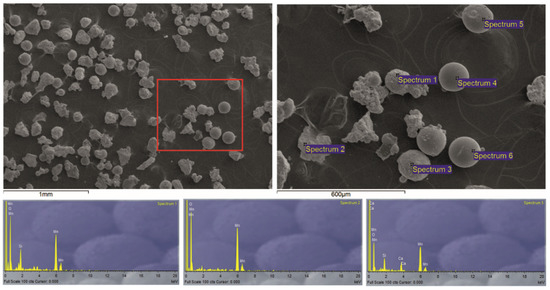 The backscattered electron (BSE) images show three types of particles in the dust sample: spherical with smooth surfaces, irregularly shaped with sharp edges and rough surfaces and composite particles containing both spheres and sharp-edged fragments. All particles, regardless of their shape, contain Mn. Nevertheless, the heavy and light dust fractions have some differences in particle composition. The heavy fraction contains only Mn, O and Si. There are exceptions, as can be seen in EDS spectra 5 (Figure 5), where Ca, i.e., Al and Mg can be found. These elements are also seen in some EDS spectra in the heavy fraction but mostly in irregularly shaped fragments. The spherical particles are mainly composed of Mn, O and Si. On the other hand, the light fraction of the dust sample contains Na, K and Fe in addition to Mn, O, Si, Ca, Mg and Al (Figure 5 and Figure 6). A more complex composition is generally typical for the light dust fraction, as seen in Figure 5 and Figure 6.