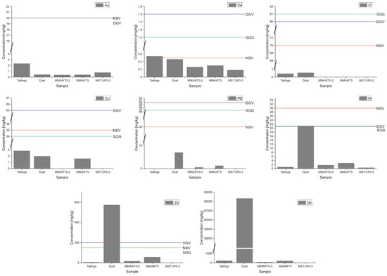 In addition to Cd and Zn, Ni in the dust sample also exceeds the threshold values, DGV and SQG, provided by the Australian government [43] and Pejman et al. [45], respectively. Again, it can be seen that the concentrations in the sediment are much lower than the threshold values.