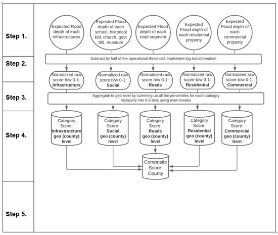 In this process, CRLjk represents the summed Community Risk Level for each of the different levels of geography-dimension combinations (j) and is simply a summation of the five dimensions (k). The process of aggregation to each geographic level was preceded in this step where a dimensional risk score was calculated for each of the five categories (residential properties, roads, commercial properties, critical infrastructure, and social infrastructure) and by year (2021 and 2051). That is, the dimensional community risk score was calculated by computing the sum of the percentiles of normalized expected depths from 0 to 100 at intervals of five for each dimension, across all POIs in that dimension and in that location. For a visualization of this process at the county level, refer to Figure 1.