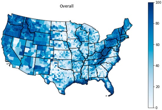 Additionally, for a more comprehensive understanding of community vulnerability, social vulnerability should be considered in addition to physical vulnerability (as addressed by []). Integration of network connectivity considerations and social vulnerability would allow for the establishment of a useful counterfactual economic scenario (such as GDP or on a smaller scale), proving useful for cost–benefit analyses. This highlights an additional opportunity for future research, where social vulnerability models gauging consumer concern for impacted infrastructures may be used to inform the weighting and integration of specific infrastructures. In this study, dimensions were selected that were judged to likely be the most visible impacts at the community level, but for different geographic levels (such as for government) and across different communities, prioritization may require analyses of different infrastructure types than those used here.