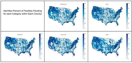 The objective of this study is to explore the development of a model for the assessment of aspects of flood risk to U.S. infrastructure, focusing on holistic impacts to communities such as through residential properties, roads, commercial properties, critical infrastructure, and social facilities. This was made possible by taking advantage of newly available parcel-level flood hazard information from the First Street Foundation (FSF) Flood Model [,,], including the integration of a first-of-its-kind national database of over 20,000 unique flood adaptation measures. The First Street data provides parcel-level flood hazard information for the four major flood types (tidal, pluvial, fluvial, and surge) at six explicitly modeled return periods while accounting for the mitigating effects of levees, dams, open spaces, and other flood adaptation measures. With high-resolution data at the property level, this study is able to estimate flood impacts to each infrastructure element from its joined parcel or building footprint.