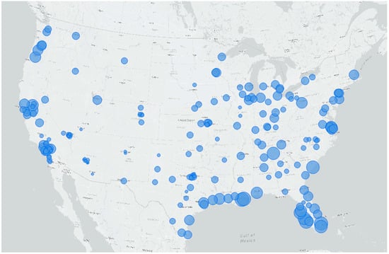Finally, the top 5 for the percentage of roads at risk are Metairie, LA (99.8%); New Orleans, LA (98.5%); Cape Coral, FL (93.8%); Stockton, CA (85.7%); and North Port, FL (81.6%). Ultimately, these results indicate a consistency in risk associated with top cities impacted across the five dimensions. Of note, Houston, TX (64.4%); Miami, FL (61.4%); Charleston, SC (52.8%); and Pittsburgh, PA (33.7%) are all major cities that have significant percentages of their road infrastructure at risk of flooding. While road infrastructure is unique in this analysis due to the fact that it is not building specific, previous research has highlighted the disproportionate effect that flooding on the road network has on flood vulnerability, such as through its impact on property values and disruption of community activity [].