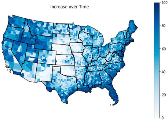 Overall risk change from 2021 to 2051 by county (change in percent of infrastructure with operational risk).