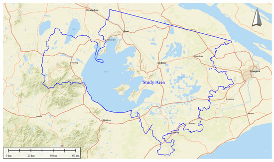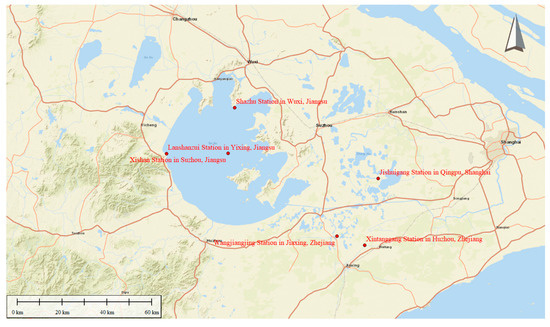 The Taihu Lake Basin is located in the south of the Yangtze River Delta, with the Yangtze River directly to the north, the Qiantang River bordering the south, the East Sea near the east, the Tianmu Mountains and part of the Maoshan Mountains to the west, and the plains, river networks, and depressions centered on Taihu Lake in the middle, with a total basin area of 36,900 km2. The east, south, and north sides are relatively high due to the influence of sedimentation from the mouth of the Yangtze River and Hangzhou Bay [10]. The location of the study area is shown in Figure 1.