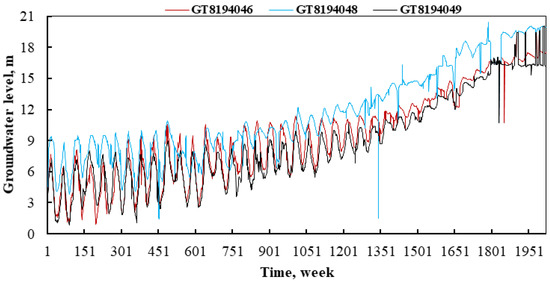 It is observed from Figure 2 that the groundwater level data at all three observation wells have some noisy data, especially at the later part of the time series. This noise in the input data was intentionally kept to evaluate the prediction power of the suggested machine-learning algorithms on the noisy input data. As such, no data smoothing operation was performed on the input time series (weekly values) of the groundwater level data.