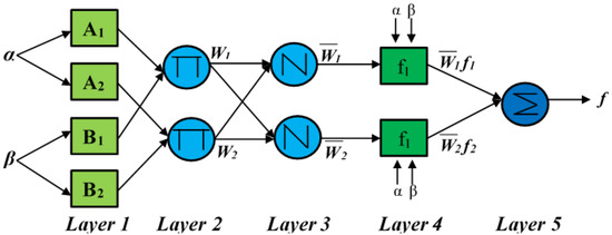 Figure 5. ANFIS structure derived from two inputs—one output first-order Sugeno FIS [77].