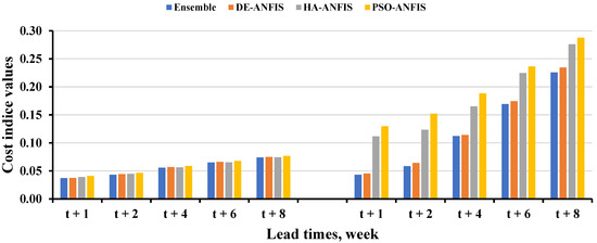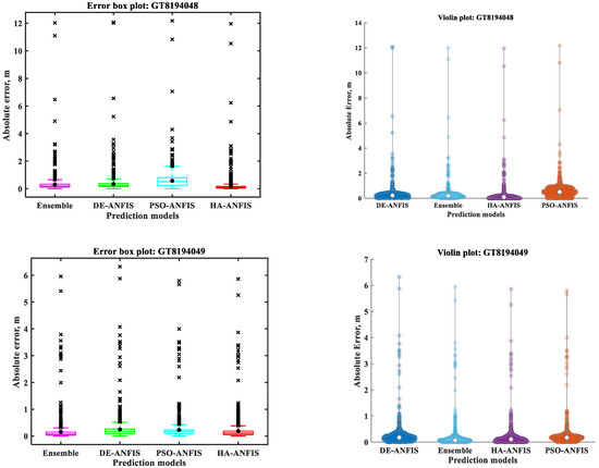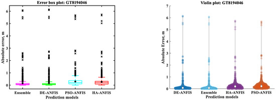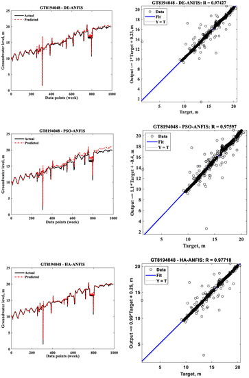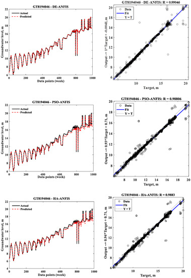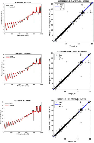 The results presented in Table 4 indicate that the DE-ANFIS performed better than the PSO-ANFIS and the HA-ANFIS, with respect to test RMSE and the absolute difference between the training and test RMSEs at GT8194046. On the other hand, the HA-ANFIS was the best performing model followed by the DE-ANFIS and the PSO-ANFIS at the observation wells GT8194048 and GT8194049 when the absolute difference between the training and test RMSEs was considered. However, based on the test RMSE, the sequence of models from the best to the worst at GT8194048 was the HA-ANFIS, the DE-ANFIS, and the PSO-ANFIS, while this sequence at GT8194049 was the HA-ANFIS, the PSO-ANFIS, and the DE-ANFIS. It is also obvious from Table 4 that the training times required to train the HA-ANFIS models were almost negligible compared to those of the DE-ANFIS and PSO-ANFIS models, and that the PSO-ANFIS required less training time than DE-ANFIS. Therefore, it can be argued that the HA-ANFIS was the best model with respect to the RMSE and training time criteria. Other performance evaluation indexes were calculated on test results for the comparison purpose of the developed optimized ANFIS models. The performance evaluation indexes employed to evaluate the prediction performances of all standalone optimized ANFIS models, and their ensemble are given in Appendix A.