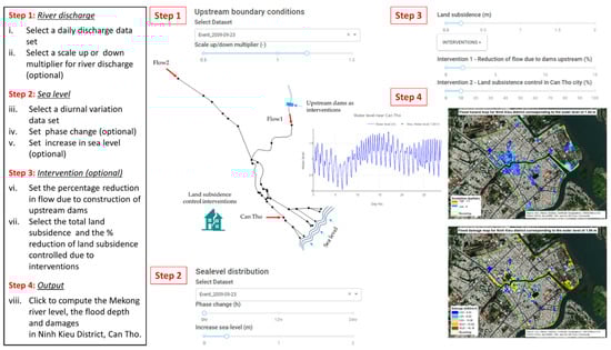 This paper presents an interactive, web-based tool, Inform, which was developed based on: (i) a simplified 1D model for the entire Mekong Delta; and (ii) flood hazard and damage maps, as well as on estimated impacts (direct damage) for the urban center of Can Tho city—Ninh Kieu district in Vietnam obtained directly from the 1D/2D coupled model for Ninh Kieu district. Inform is designed with the aim of satisfying the above-mentioned user requirements, allowing users to assess different scenarios and receive visual outputs within one minute. Pilot testing with experts to evaluate the tool’s key features (e.g., user interface, the effectiveness of the tool and its outputs) was conducted. For the evaluation, seven criteria were used, which were extracted through an extensive review of literature on interactive tools [15,16,17,18,19,20,21,22,23,24,25,26,27,28,29,30]. Inform is used here to demonstrate how it can be used to support rapid flood risk assessment to facilitate a co-designing approach aiming at exploring, identifying and selecting flood risk reduction measures for Ninh Kieu district with the stakeholders’ participation.