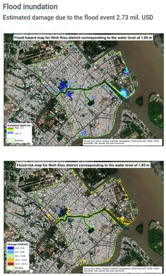 Like in most other flooding contexts, floods in Can Tho affect the urban poor and economically weaker sections in the city [46,47]. By overlaying demographical data on the computed flood damages, the impact and vulnerability of different social strata can be determined by the city planners. According to Chinh et al. (2016) [47], the average damage due to the year 2011 flood event at every household was about USD 333/-, whereas the average monthly income of a vulnerable household was USD 185/-. This means these households lose two months of income to floods and have to spend money on their economic recovery as well. Inform can be further updated by integrating grid-level demographic and socio-economic data to generate the community-specific economic impact and vulnerability maps without any additional input efforts from the user. Such information can help the city administrators to develop location-specific socio-economic interventions, such as providing grants, subsidies, or soft loans for the vulnerable low-income households to flood-proof their houses [48]; and also to assess the ripple effect of interventions within the neighborhood.