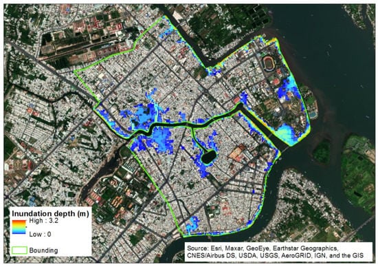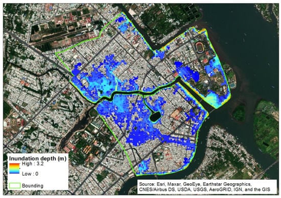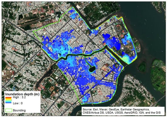 The Inform output can help the strategic planners to determine optimal protection levels for FRM infrastructure, preparedness measures for the study area and develop appropriate policies to support FRM and strategize delta planning [40]. More specifically, the river water level generates maximum inundation depths at grid level in the city center (Figure 2) and will help identify the flood hazard in those grid cells, which would help the determination of flooding hotspots. The flood hazard map can also help the city officials to identify critical infrastructure and community at the risk of flood by overlaying the inundation map on their critical infrastructure and demography GIS database. Grid level flood hazard details from Inform can lead to the development of flood hazard ranking of grid cells or community pockets, which is a vital piece of information to channelize relief actions in the event of flooding. This will aid the city administration to contextualise the flood risk problem in Can Tho and help planning, implementation and coordination of FRM and relief measures in the near future or in the long term [41].