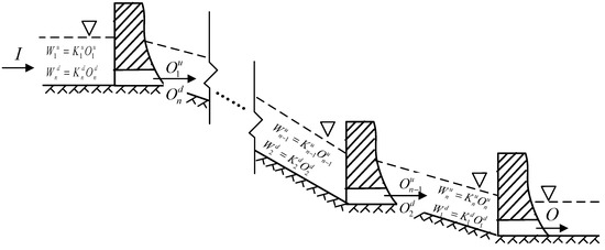 As illustrated in Figure 1, there are two numbering systems, named as “up-numbering system” and “down numbering system”, respectively. In the up-numbering system, reservoirs are numbered from upstream to downstream, denoted by superscript “u”. In the down-numbering system, reservoirs are numbered from downstream to upstream, denoted by superscript “d”. The outflow and storage of each reservoir are or and or , respectively. The linear relationship between outflow and storage of each reservoir is given in Figure 1.