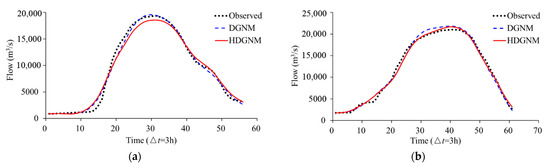 The comparison between the DGNM and other models, including the widely used Muskingum method and dynamic wave model (DWM), was made in Yan et al. [20]. The results show that the DGNM can provide comparable (to DWM) or even better results (to Muskingum), thus the DGNM was selected as a performance benchmark. The SCE-UA algorithm was employed to obtain the parameters of these two models, and the results of the optimization were that n = 3, K = 3.51 h for the DGNM and n = 3, K1 = 1.58 h, K2 = 8.80 h, K3 = 1.59 h for the HDGNM. The numbers of the linear reservoirs are both expected to be three in these two models. The difference lies in the storage parameter K. In the DGNM, the three linear reservoirs are equivalent, which is essentially a homogenization of the topographical differences of the subreaches. However, in the HDGNM, two of the three linear reservoirs with K1 = 1.58 h and K3 = 1.59 h are approximately the same, and the other one is quite different from the two with a value of 8.80 h. Therefore, the HDGNM can more objectively reflect the influence of topographical differences on the storage routing of the river channel, and thus can improve the accuracy of the flood routing.