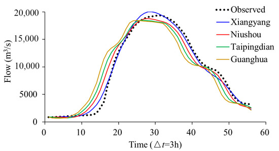On the other hand, traditional routing models, such as the Muskingum model and DGNM, estimate the parameters using the basin characteristics representing the inlet and outlet of the river reach [40], therefore the simulation is limited to the outflow. By adjusting the parameter n, the HDGNM with variable parameters can estimate flood process of any section between the inlet and outlet. From this perspective, most traditional routing models are lumped whereas the HDGNM is semidistributed. Figure 4 shows an example calculated by the flood event in Oct-1974. When n is set to 1, 2, 3, and 4 in Equation (15), respectively, the flood hydrograph of each section from upstream to downstream can be easily obtained. The sections from upstream to downstream are Guanghua, Taipingdian, and Niushou in turn, and Xiangyang is the outlet section. Only the observed outflow at the outlet section was shown due to a lack of the observed data for other sections in Figure 4. In a nutshell, the HDGNM using the SCE-UA algorithm can achieve the best simulation results in gauged basins, while the estimation method based on the physical characteristics makes the HDGNM transfer well to the ungauged basins. What’s more, as a semidistributed model, the HDGNM has a potential to estimate the flood process of any section between the inlet and outlet.