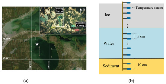 In situ observation of water temperature in this research was completed near the west bank of the pond that lies in the middle of Qinghuahu Lake, see Figure 1a. Water at the measurement point is around 1.87 m deep. Qinghuahu Lake starts to freeze in late October and early November every year and its ice sheets begin to melt in mid to late April in the following year. When the flood season arrives in July and August, the water level increases in this lake, which is one of the places in Daqing City that regulates excess water to control floods. Nevertheless, in winter, there is no river flowing into or out of the lake; therefore, the water level in this lake basically remains stable, and the water body creates a lentic environment that provides ideal conditions for in situ observation.